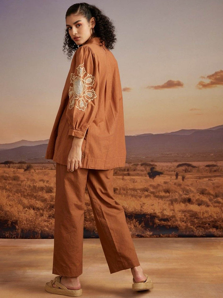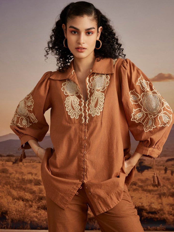 Floral Embroidered Puff Sleeves Shirt With Trousers