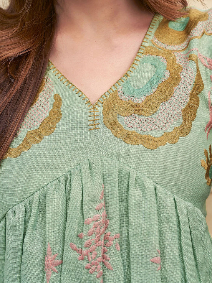 Floral Embroidered V Neck linen Tunic With Trousers