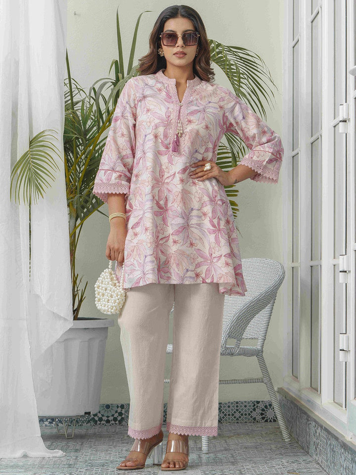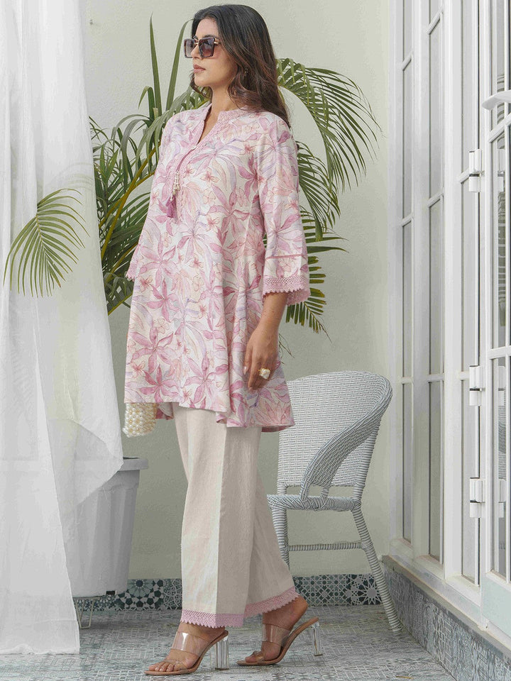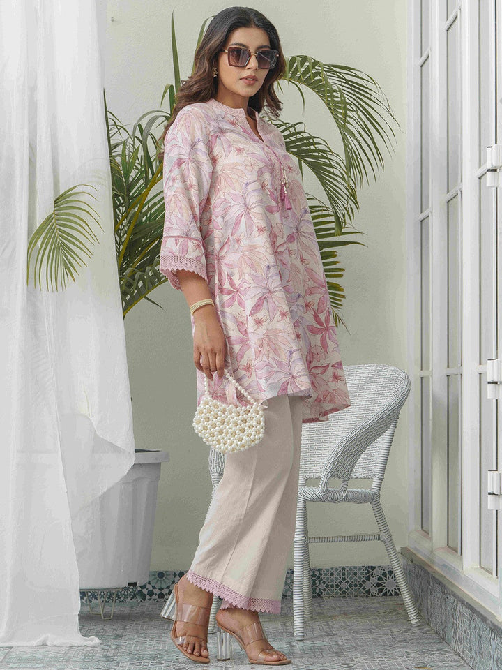 Floral Printed Mandarin Collar Linen Tunic With Trousers